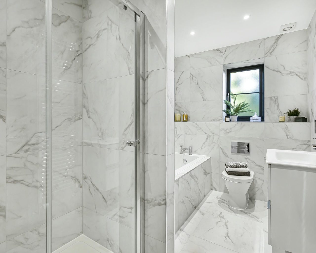 - Ladder towel radiators and high-quality tiling throughout