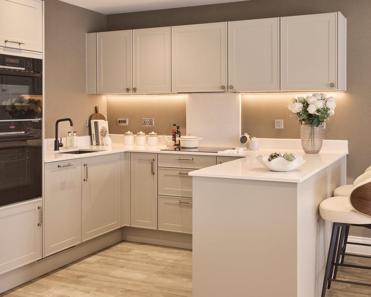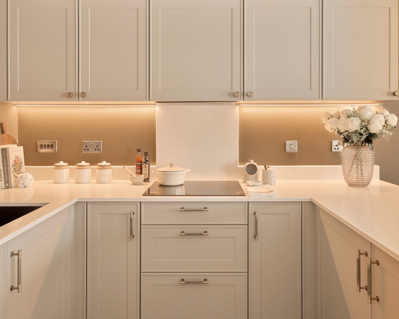 • LEICHT GERMAN-DESIGNED FITTED KITCHEN WITH QUARTZ WORKTOPS AND UPSTAND